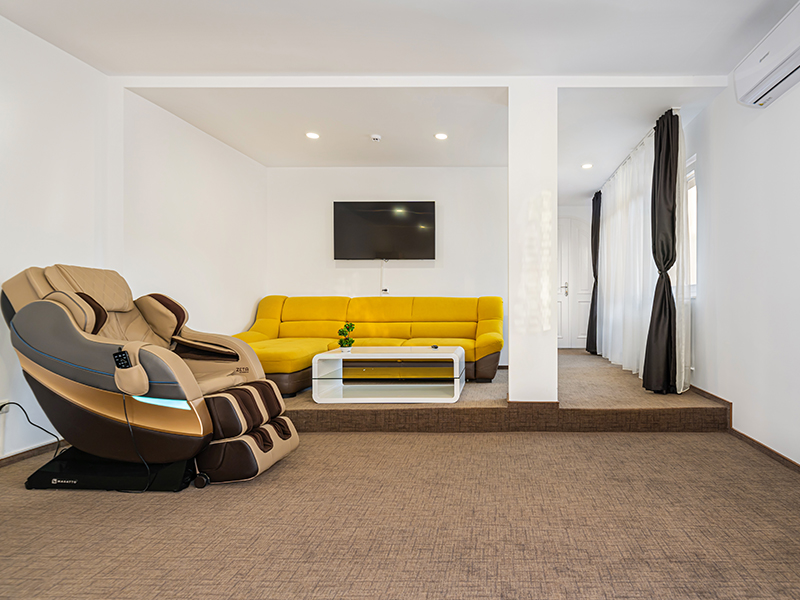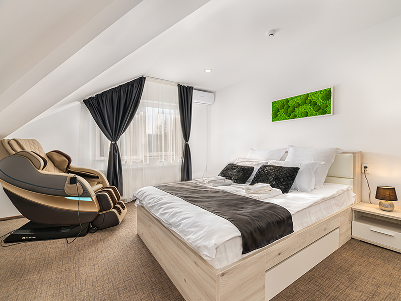 Curatenia la cel mai inalt nivel, produsele complete de igiena din baia, patul foarte confortabil si desigur, fotoliul de masaj enorm de apreciat.