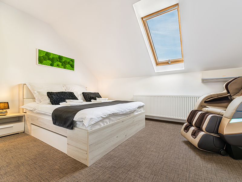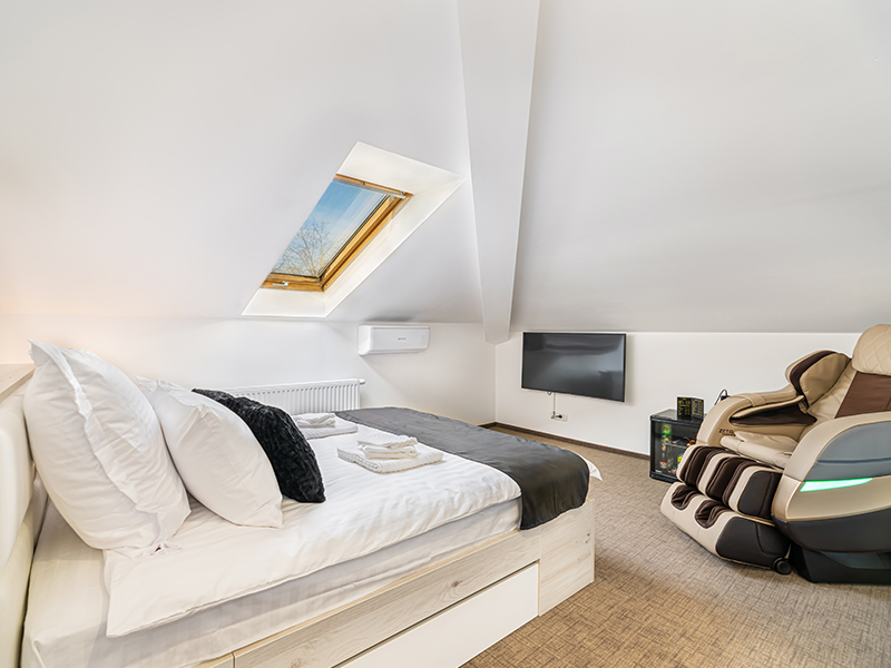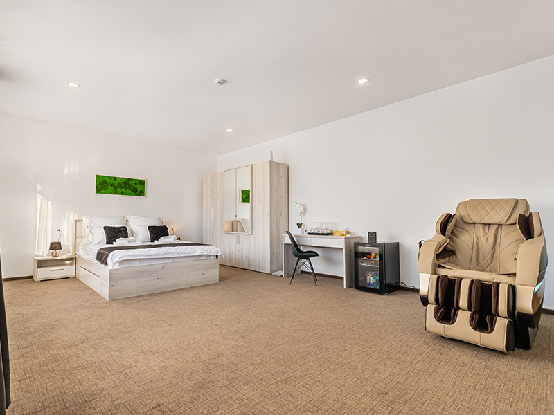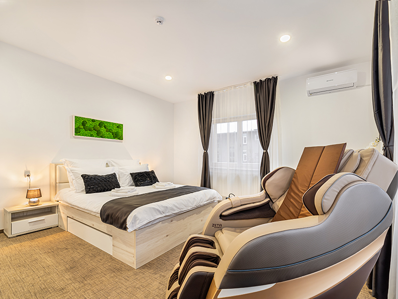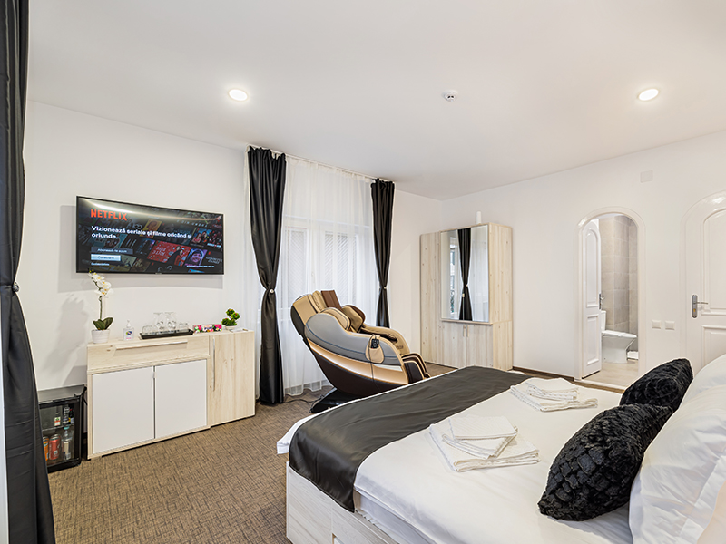 Curatenia la cel mai inalt nivel, produsele complete de igiena din baia, patul foarte confortabil si desigur, fotoliul de masaj enorm de apreciat.