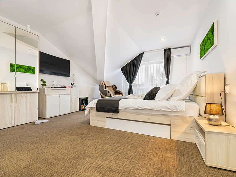 Bada Bing Residence va pune la dispozitie pentru cazare in Brasov 9 camere cochete, cu suprafete cuprinse intre 15 mp si 38 mp. Focusul nostru in decorarea si dotarea camerelor a fost ca oaspetii nostri sa beneficieze de siguranta (prin seifurile puse in dulapuri, acces pe baza de cod), relaxare prin (fotolii de masaj care se regasesc in fiecare camera), entertainment (prin facilitatile multimedia TV Smart, avand acces la ultimile aparitii ale filmelor prin abonament la Netflix, HBO Go si Rakuten), stare de bine prin varietatea kitului de cosmetice, minibar.